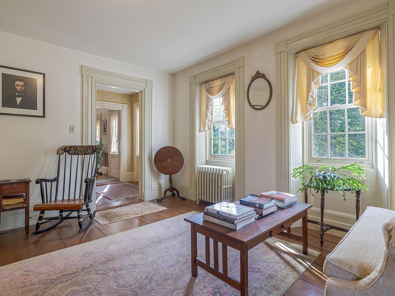 A bright sitting room features two large sash windows with ornate off-white trim, framed by light beige swags and ruffled curtains. The wooden floor is partly covered by a pale, intricately patterned rug. In the foreground, a simple wooden coffee table is stacked with books. To the left, a classic black rocking chair with gold painted details sits next to a small side table. There is a framed portrait on the wall above the chair. A leafy green plant in a decorative stand is near the window, and an antique drop-leaf table rests by the doorway. The walls are a soft cream, adding warmth to the serene, historic ambiance.