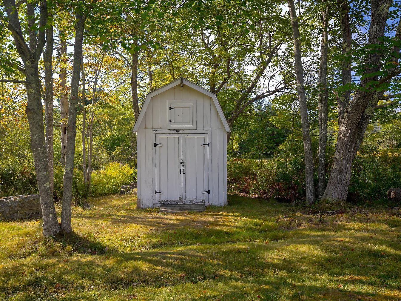 A small, white barn-style shed sits on a patch of sun-dappled grass, surrounded by tall trees that provide partial shade and an intimate woodland atmosphere. The shed has a gambrel roof and double doors secured with black metal hinges, as well as a small second-floor door above. The weathered wood and simple construction evoke rustic charm and practical simplicity. The surrounding greenery features a mix of mature trees, shrubs, and untamed grass, with filtered sunlight creating a peaceful, secluded feeling. The overall setting blends natural beauty and historic rural functionality, offering both utility and a picturesque view.