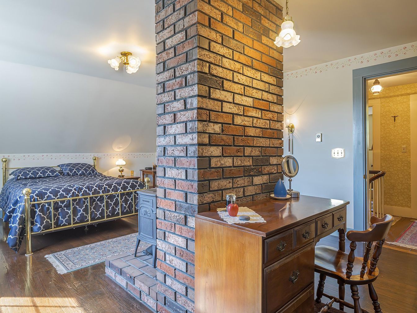 A brick chimney divides the room, creating a visual separation between the sleeping and dressing spaces. On one side, a brass-framed bed with navy, patterned bedding sits beneath a sloped ceiling, flanked by vintage bedside lamps and a small rug on polished hardwood floors. On the other, a wooden vanity with an ornate chair and small round mirror is neatly arranged, accented by classic perfume bottles and a delicate doily. The walls are painted pale blue-gray with a subtle floral border trim, and soft, traditional light fixtures hang from the ceiling, contributing to a cozy and nostalgic atmosphere.