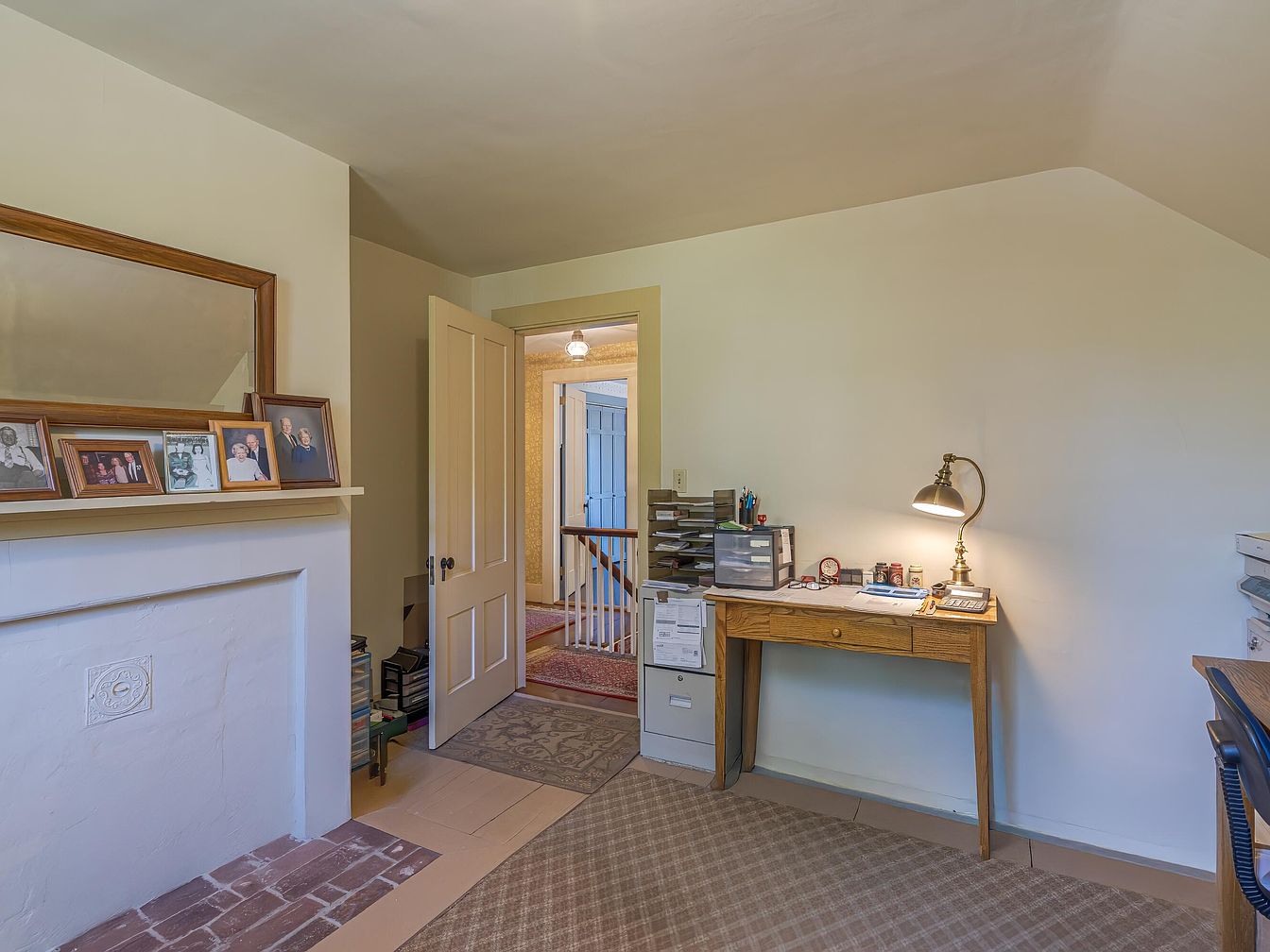 A cozy workspace with a traditional feel is set in a corner of the house, featuring a wooden desk lit by a brass desk lamp. The desk holds office supplies, organizers, and paperwork, creating an inviting and functional study area. To the left, a white-painted fireplace with brickwork at the base is topped by several framed family photographs and a wooden-framed mirror, adding a personal and warm touch. The walls are painted a soft neutral shade, and the floor is covered with a beige carpet in a simple pattern. An open door leads to a hallway with visible period details, like a wooden stair railing and old-fashioned light fixtures.