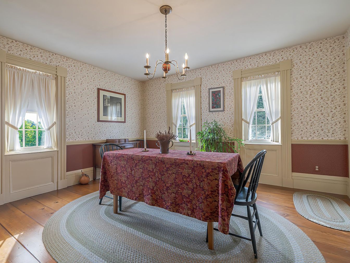 Central to the space is a rectangular dining table covered with a patterned burgundy cloth, surrounded by four black wooden chairs, two of which are visible in the foreground. The room features wide plank wooden floors and an oval braided rug beneath the table. The walls are adorned with delicate floral wallpaper above a muted russet wainscoting, bordered by cream trim. Three tall windows with sheer, tied-back curtains allow natural light to pour in, highlighting the gentle, antique ambiance. A simple brass chandelier hangs overhead, and potted greenery rests near the window, complemented by framed artwork and minimal decor.