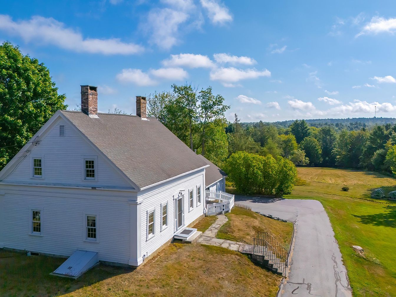 A classic historic American home sits on a spacious, sunlit property with a backdrop of rolling hills and a lush tree line. The house is painted crisp white and features simple, symmetrical windows framed with traditional trim. Two sturdy brick chimneys rise above a shingled gabled roof, adding to the New England farmhouse charm. Stone steps and a short pathway lead to a side entry, and a sloping driveway curves beside the home. The expansive lawn is bordered by clusters of mature trees and shrubs, offering wide views and a peaceful, rural ambiance under a bright blue sky with scattered clouds.