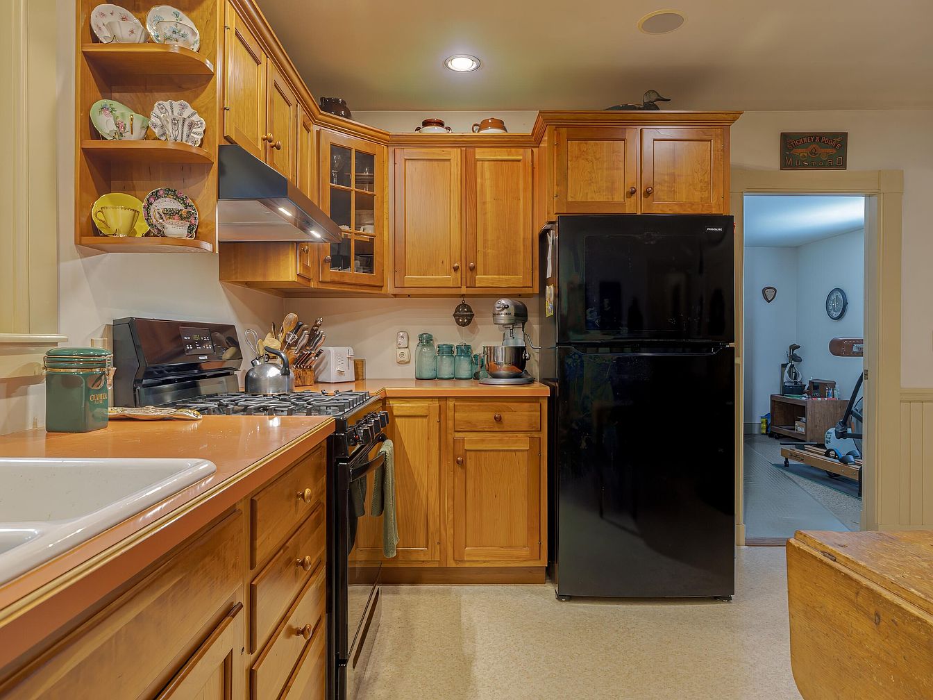 Warm wooden cabinetry fills the cozy kitchen, with upper and lower cabinets in a honey-toned finish and simple round knobs. The countertop is a muted orange, complementing the cabinetry’s warmth, and is paired with a white farmhouse-style sink in the foreground. A black gas stove and matching refrigerator add contrast, while a sleek vent hood sits above the stove. Open corner shelves display colorful decorative plates and teacups, enhancing the vintage charm. Aqua glass canisters and a stand mixer sit on the counter, accentuating the functional yet homey atmosphere. The adjacent room is visible through an open doorway, continuing the inviting theme.