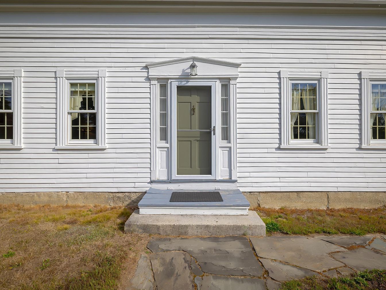 A classic American home exterior featuring a symmetrical layout of four tall, narrow windows framing a central front door. The facade is clad in horizontal white wooden siding with crisp trim and molding around the windows and door, conveying a sense of historic charm. The entry door is muted green-gray with glass inserts on either side, and a small triangular pediment supported by columns above the door lends an air of formality. A concrete step and small landing, covered with a simple black mat, lead up from a flagstone walkway set into the dry, patchy grass surrounding the house’s base.
