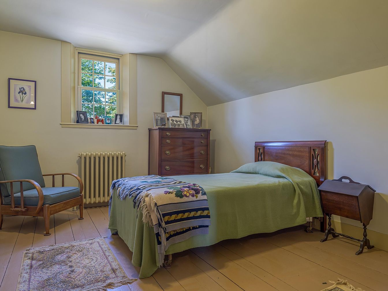A cozy, historic bedroom features warm beige walls and a gently sloped ceiling, with natural light streaming in through a small, multi-pane window. The single wooden bed has an intricately carved headboard, covered by a light green bedspread and a colorful, floral-patterned crocheted throw at the foot. A mid-century wooden lounge chair with muted blue upholstery and a simple patterned rug nearby add comfort and style. There is a classic wooden dresser topped with framed photographs in black and white, and a small wooden sewing box stands beside the bed. The radiator and framed flower print add subtle details, enhancing the room’s inviting and nostalgic feel.