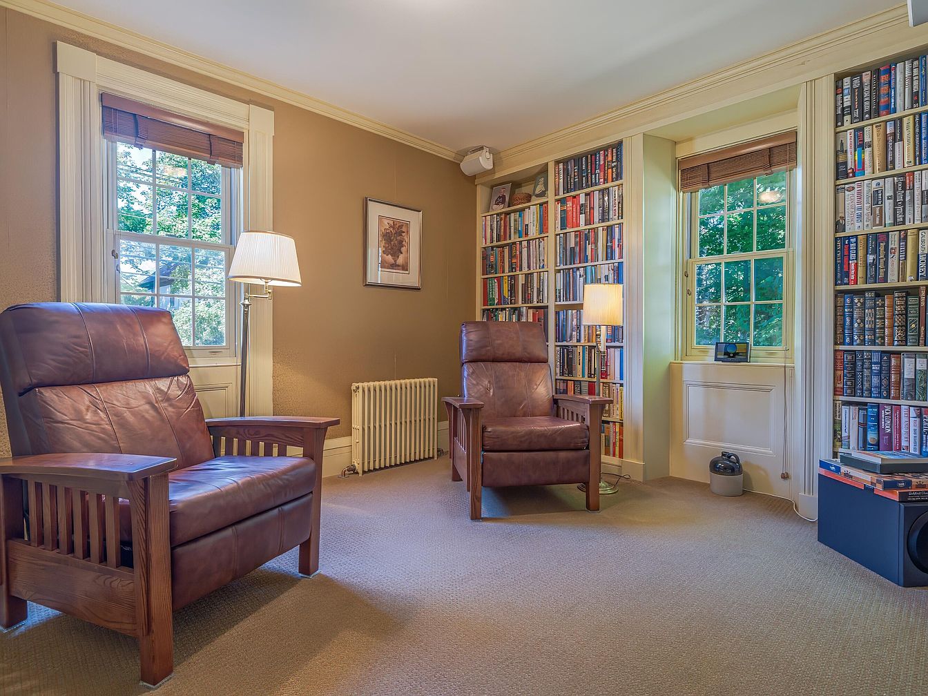 A cozy space filled with warm, natural light from two large paned windows framed by classic cream moldings and topped with wood blinds. Soft beige carpeting covers the floor, complementing the walls painted in a muted tan. Flanking the windows, built-in bookshelves are packed with colorful spines, adding visual interest along the back wall. Two substantial wooden armchairs with brown leather cushions create a comfortable setting for reading. A standing lamp and table lamp provide additional lighting. The atmosphere is inviting and intellectual, perfect for relaxation or private reading. A small radiator and minimal décor reinforce the room’s classic American style.
