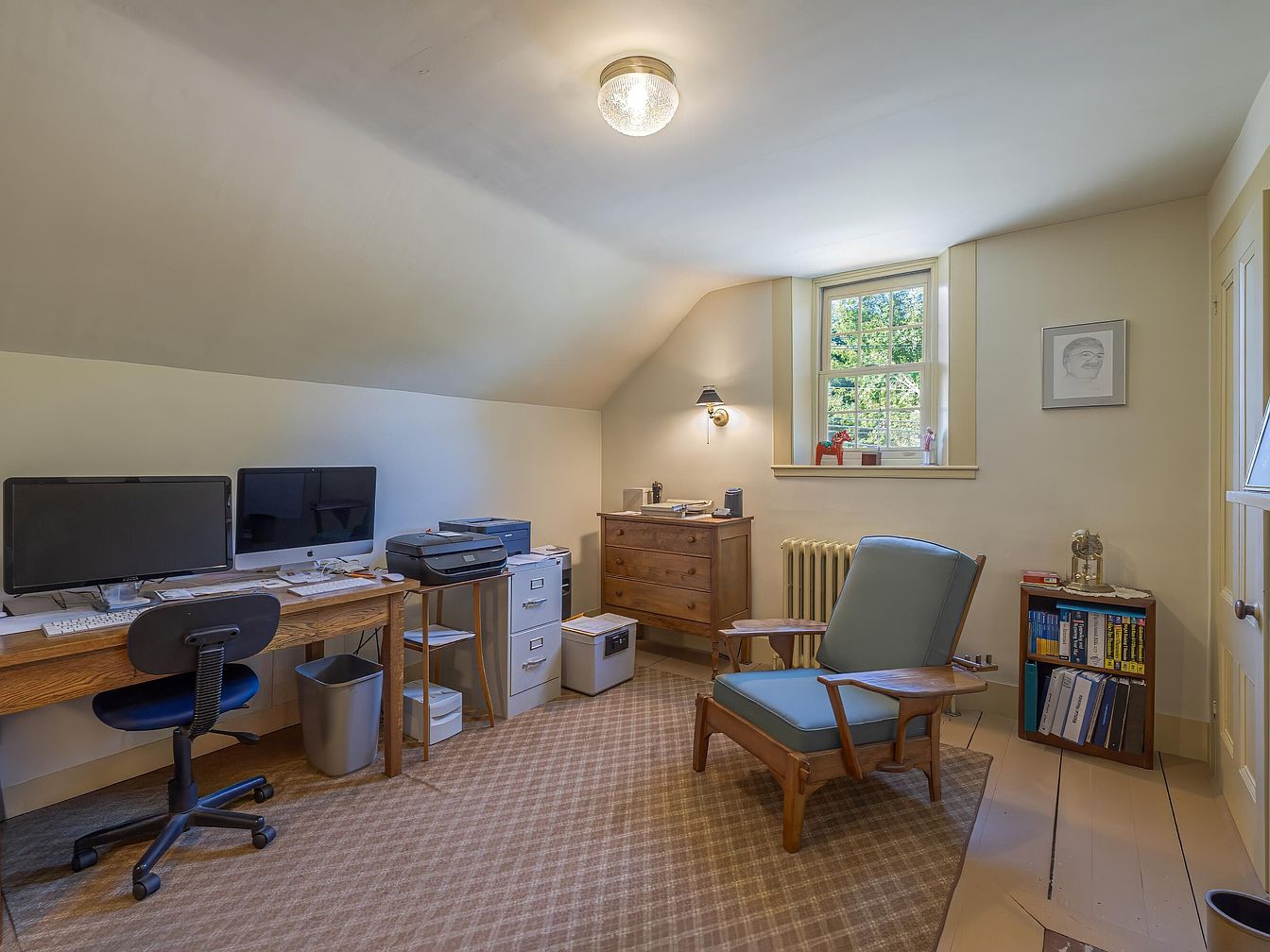 A cozy, sloped-ceiling workspace features neutral beige walls and cream trim, illuminated by a ceiling fixture and natural light from a multi-pane window. The room contains a wooden desk with two monitors, a printer, and organized papers, supported by a rolling office chair. Practical storage includes silver filing cabinets, a wooden chest of drawers, and a compact bookshelf filled with books and binders. An armchair with blue upholstery and wooden framing sits on a subtle plaid-patterned carpet, offering a relaxing spot near the window. Minimal artwork, efficient furniture, and soft colors contribute to a calm, organized aesthetic ideal for productivity.