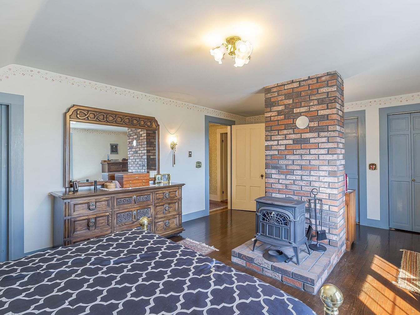 This inviting bedroom features a large exposed brick chimney with a vintage black cast iron wood stove as its focal point. The room is filled with natural daylight, adding warmth to the blue-gray trim and closet doors. A dark wood dresser with ornate carving sits beneath a large mirror, enhancing the traditional aesthetic. The bed is dressed in a dark comforter with a bold geometric pattern, accented by golden bedposts. Hardwood flooring, a few decorative touches on the mantle and wall, and classic brass and glass ceiling fixture complete the space, evoking both comfort and historic charm.