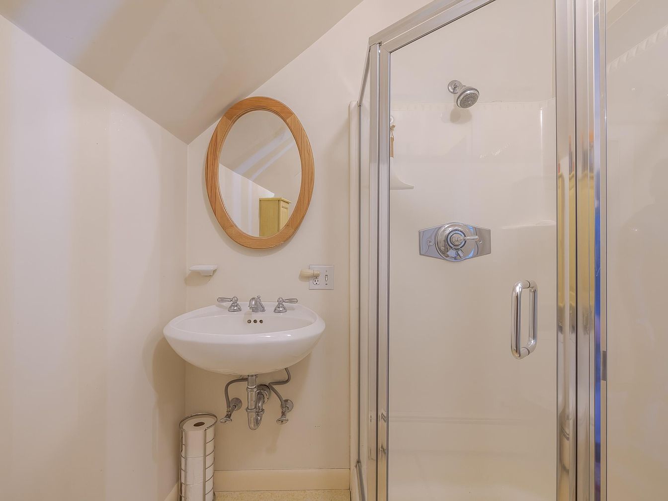 A small bathroom corner features a compact white porcelain pedestal sink with classic chrome twin faucets and plumbing exposed below. Above the sink hangs a simple oval mirror framed in light wood, creating a warm contrast against the pale cream walls. To the right is a clear glass shower enclosure with chrome fixtures, including a shiny control panel and overhead showerhead. The ceiling slopes downward, suggesting the bathroom is tucked under a staircase or in an attic space. A vertical toilet paper holder stands beside the sink, and the overall decor feels minimal and functional, emphasizing clean lines and subtle contrasts.