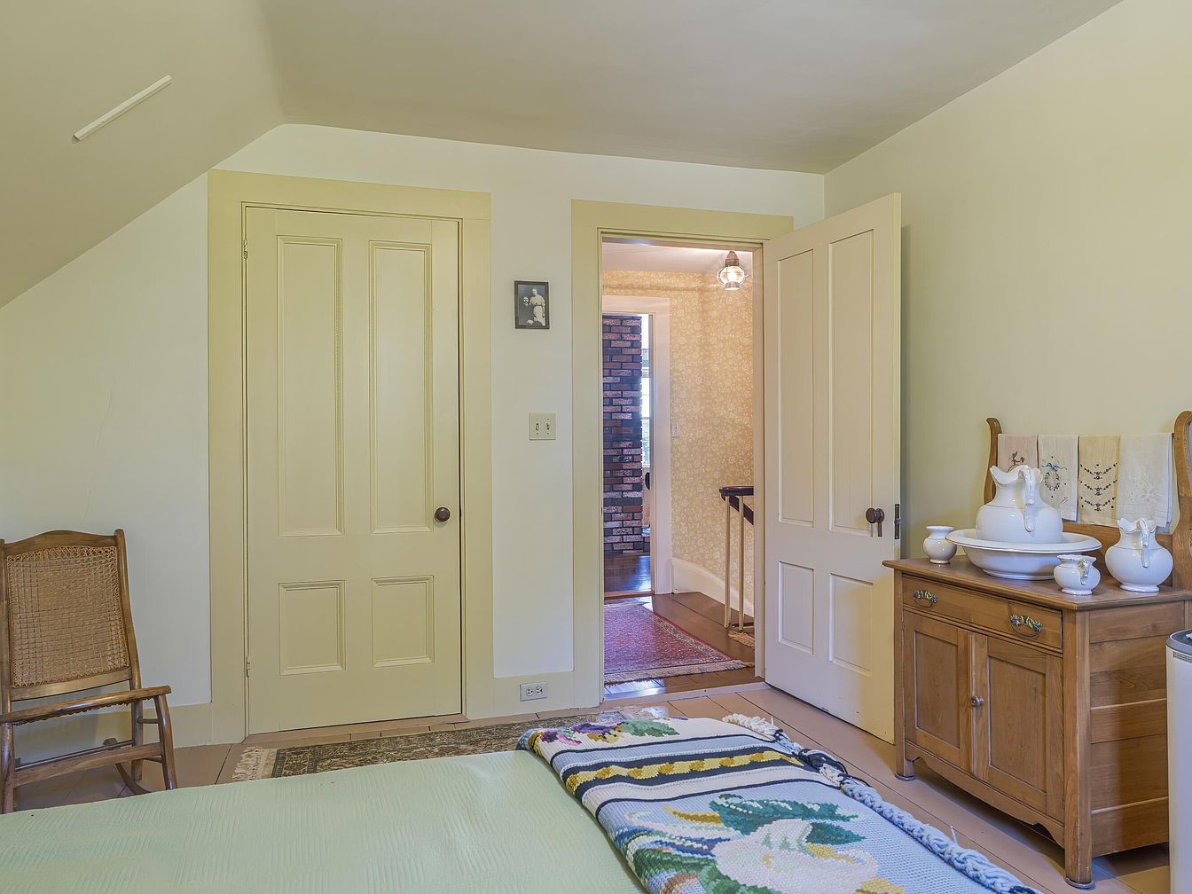 A cozy bedroom features soft cream-colored walls and matching trim, creating a serene and gentle atmosphere. In the foreground, a bed topped with a crocheted floral blanket sits beside a vintage wooden dresser displaying a white pitcher and basin set, complete with small matching cups and decorative hand towels draped against the backsplash. Old-fashioned doors, one leading to a hallway covered in warm, floral-patterned wallpaper, maintain the room’s historic character. A wooden rocking chair stands next to the closed door, and natural light enhances the warm, inviting feel typical of an early American home.