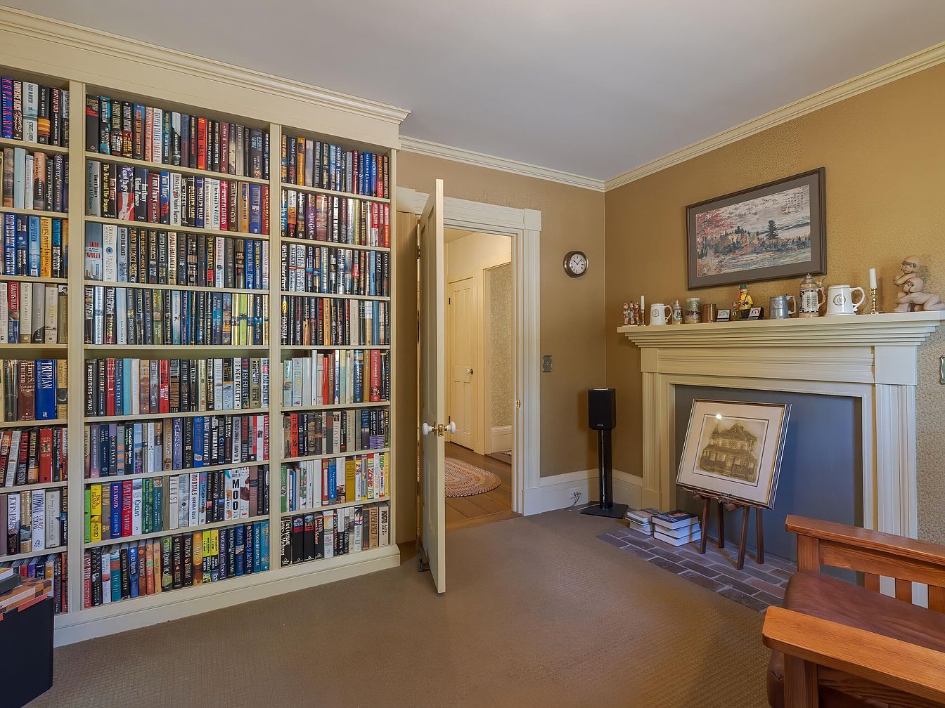 A cozy library corner featuring a floor-to-ceiling built-in bookshelf overflowing with colorful spines of assorted books. Warm beige and gold tones create an inviting atmosphere. A white-painted fireplace with decorative molding anchors the space, its mantel adorned with collectibles, mugs, and figurines. A framed artwork hangs above while another framed piece leans against the fireplace, resting on an easel. Carpeting in a muted tan covers the floor, complemented by classic white-trimmed doors and crown molding. The overall style evokes a sense of tradition and comfort, perfect for reading or quiet reflection.