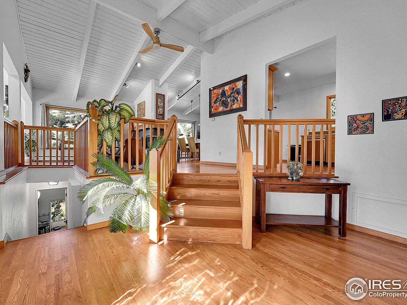 A wide, light-filled entry landing with warm, honey-toned hardwood floors and railings welcomes guests. A set of stairs leads up to an open living space where sunlight pours in from expansive windows, offering views of greenery outside. White-painted, vaulted ceilings with exposed beams and a modern wood ceiling fan further brighten the area. Lush indoor plants add fresh energy and life. The walls are adorned with colorful, abstract artwork for visual interest, while a simple wooden side table provides a functional accent. The overall feel is airy, welcoming, and a harmonious blend of natural and artistic elements.