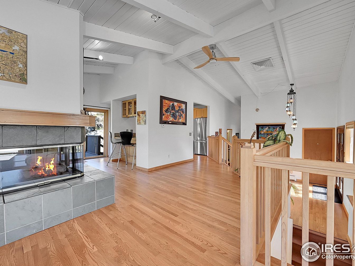 A bright, open upstairs landing area features warm hardwood floors and crisp white walls, complemented by a soaring vaulted ceiling with exposed beams. A sleek, contemporary double-sided fireplace with gray tile surround anchors the space, adding both warmth and a modern touch. Light wood railings and accents frame a staircase leading down, with a leafy plant and colorful hanging pendant lights adding soft textures and personality. Natural light streams in through multiple windows, while artwork and a ceiling fan enhance the airy, relaxed atmosphere. Hints of a kitchen and outdoor deck are visible, blending living and entertaining spaces seamlessly.