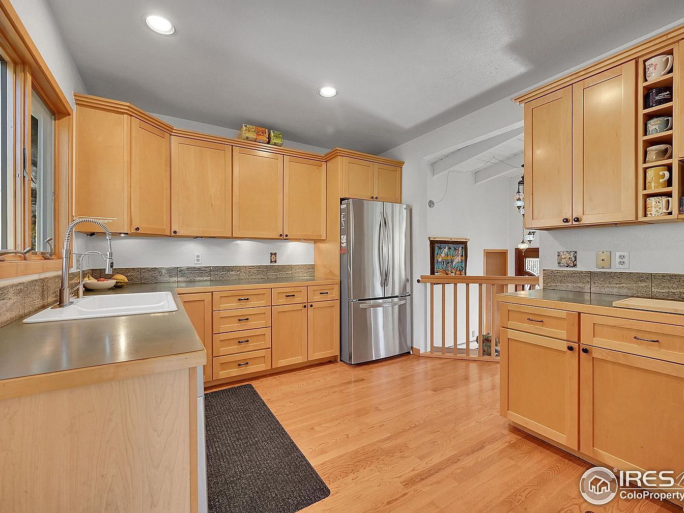 Spacious kitchen featuring light wood cabinetry with simple black knobs, complemented by warm wood flooring and neutral countertops. The layout includes extensive upper and lower cabinets, with several small drawers and open cubbies for mugs near the refrigerator. Stainless steel appliances, including a modern double-door fridge, add a contemporary touch. A large window by the deep sink provides natural light, enhanced by recessed ceiling lights. The backsplash is a subtle stone pattern, and there’s a prominent chrome faucet with a high-arching, flexible spout. The overall design blends modern efficiency with a cozy, natural warmth.