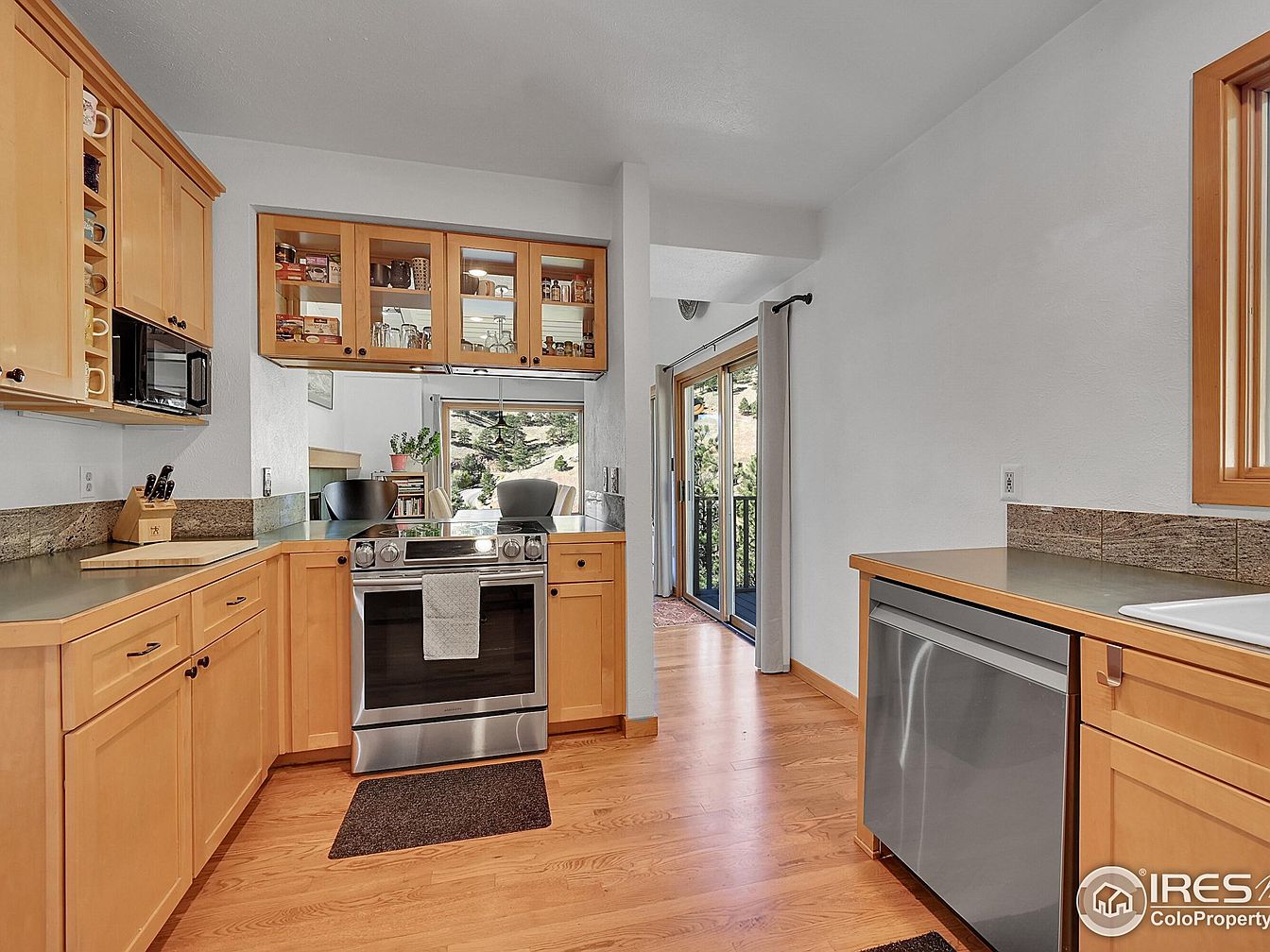 Warmly lit kitchen space featuring honey-toned wooden cabinetry with dark round knobs, paired with neutral countertops and a matching hardwood floor. Stainless steel appliances, including an oven and dishwasher, add a sleek, modern touch. A built-in microwave and organized knife block are neatly arranged to the left. Over the stove, glass-fronted upper cabinets display a collection of mugs and glassware. The kitchen opens toward a sunlit dining area through a wide interior window and sliding glass doors, bringing in abundant natural light and providing a glimpse of lush greenery outside. Overall, the style is tidy, functional, and inviting.