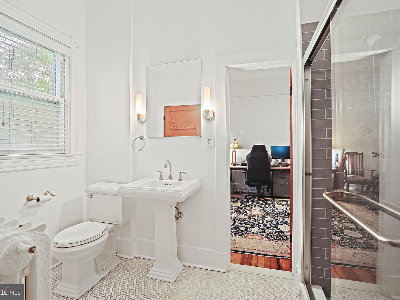 The bathroom features a clean, minimalist design with a predominantly white color palette, enhancing a sense of spaciousness. A vintage-style pedestal sink, characterized by elegant curves, sits next to a sleek, modern toilet. The hexagonal floor tiles add texture beneath the feet, contrasting beautifully with the smooth wall surfaces. A single light fixture complements the contemporary mirror, providing illumination. Adjacent to the bathroom, a door reveals a glimpse of an office space, showcasing a desk and rolling chair, combining utility with aesthetic appeal. The overall ambiance is bright and refreshing, harmonizing traditional and modern design elements.