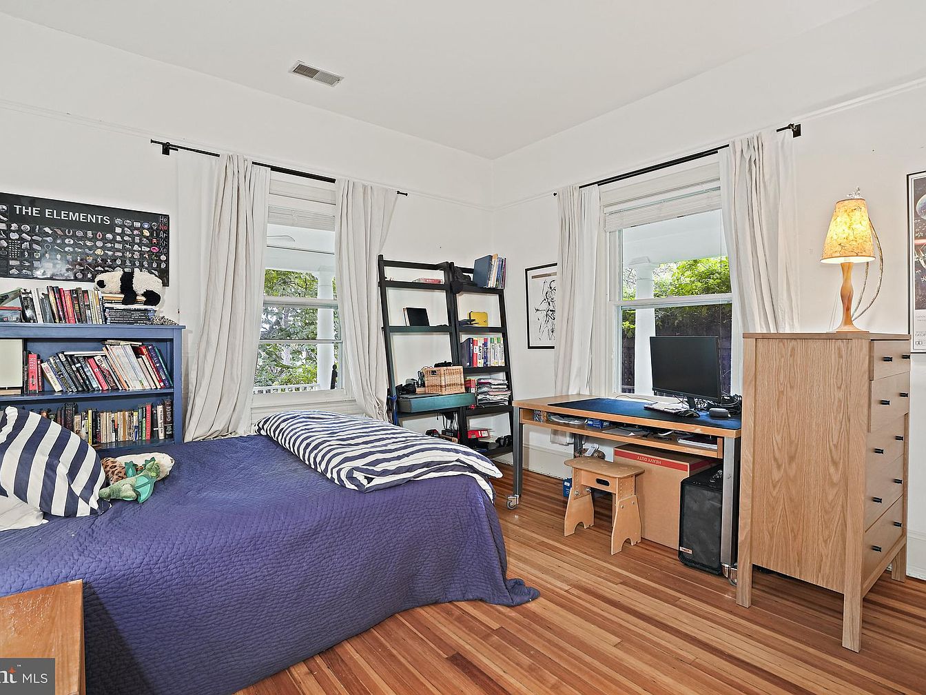 A cozy bedroom featuring warm wooden flooring and soft white walls. A large bed, adorned with a deep purple quilt and striped pillows, sits prominently in the space. To one side, an eclectic bookshelf painted in deep blue holds a variety of books and decorative items. Natural light streams through two large windows dressed with flowing white curtains, accentuating the airy atmosphere. A simple wooden desk provides a workspace, complemented by a lamp that adds a soft glow. A lean silhouette from a tall dresser adds height and balance, while framed art adds character to the serene environment.