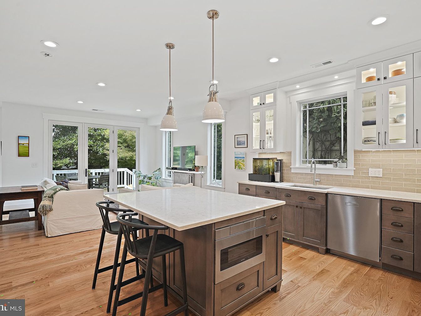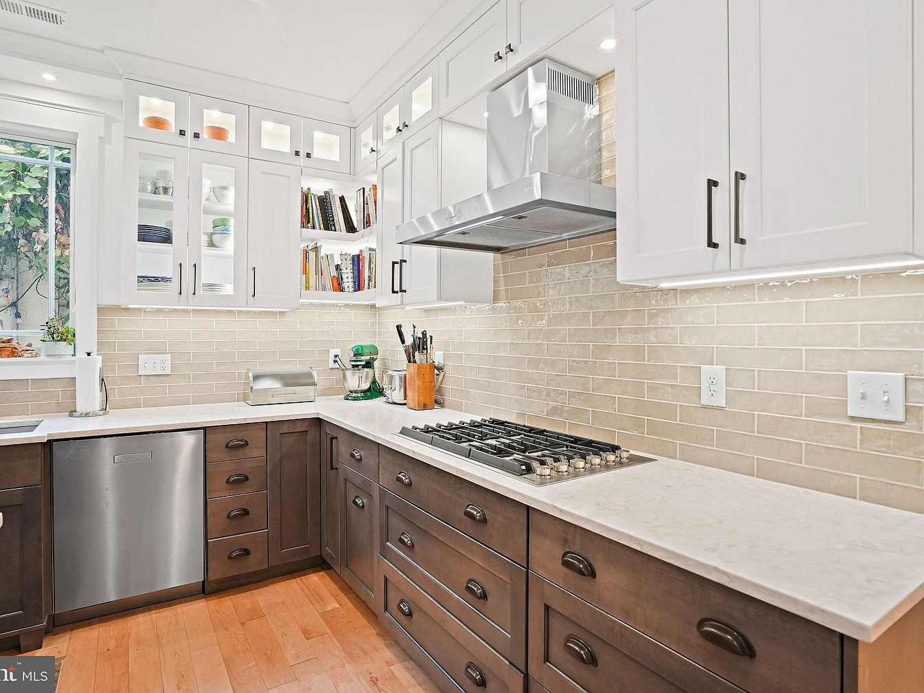 This modern kitchen features an open layout with a central island topped with a white marble countertop. Dark wooden cabinets contrast with the light cabinetry above, showcasing glass-fronted storage. A large window invites natural light, highlighting the warm tone of the hardwood flooring. Sleek stainless steel appliances and a stylish hood above the cooktop are balanced by elegant pendant lighting. Soft beige backsplash tiles add a subtle texture behind the stovetop, while minimalist black stools around the island enhance the contemporary feel. The space combines functionality with a fresh, inviting aesthetic.