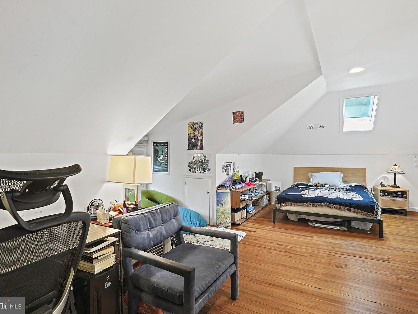 The attic bedroom features a cozy, sloped ceiling, enhancing the space’s charm with natural light streaming in through a skylight. Soft white walls contrast with warm wooden flooring, creating an inviting atmosphere. A simple bed with a patterned blanket is positioned beside a nightstand topped with a lamp, balancing functionality and aesthetics. Adjacent, a comfortable blue armchair complements the workspace, which includes a vintage desk chair and a stack of books. Decorative elements like artwork adorn the walls, adding personality. The overall layout, combining relaxation with a study area, showcases a practical yet comfortable living space.