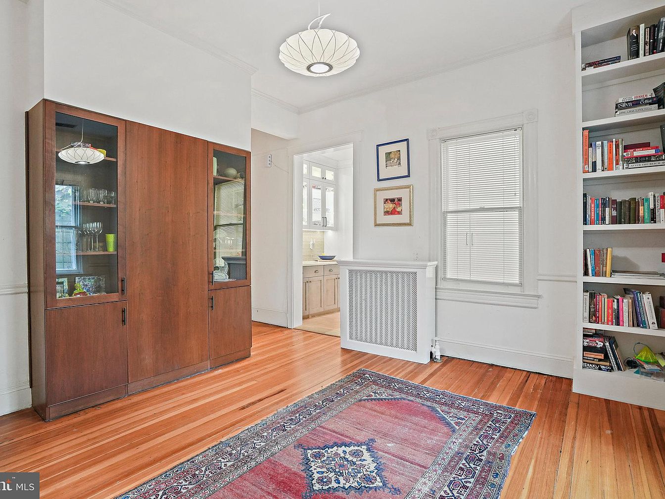 This cozy dining area features elegant hardwood flooring, with a vibrant area rug that adds warmth. A sleek, mid-century modern display cabinet occupies one corner, showcasing glassware and decorative items. Natural light floods the space through window treatments, enhancing the light palette of white walls. A contemporary pendant light hangs from the ceiling, providing modern contrast. Framed art pieces adorn the walls, adding personality. Adjacent, a built-in bookshelf neatly displays a collection of books. The overall aesthetic merges vintage charm with modern simplicity, creating an inviting atmosphere for gatherings or quiet evening meals.