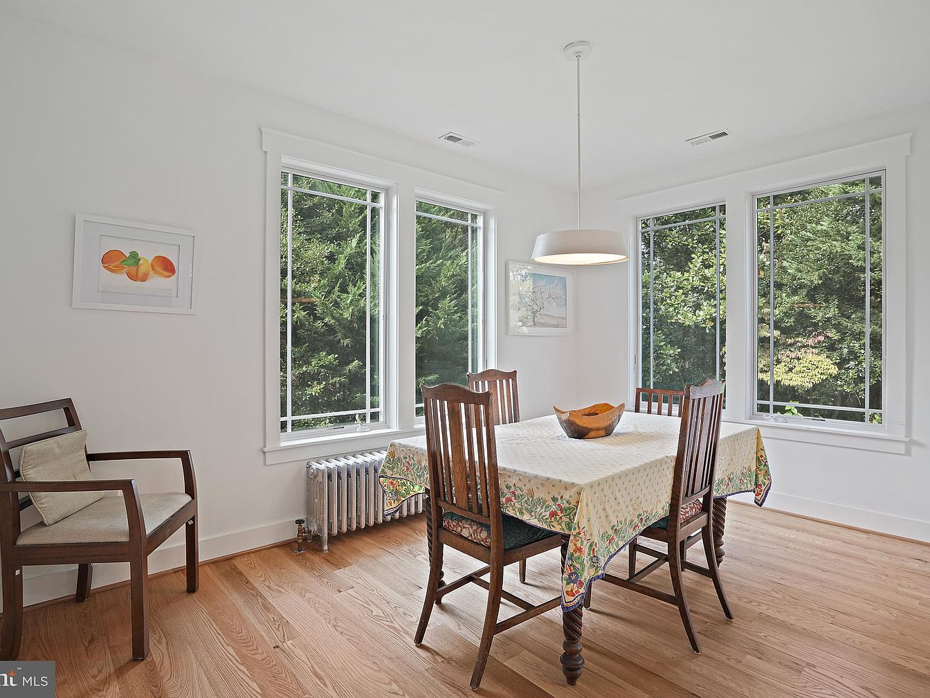 This cozy dining area features a light-colored wooden table surrounded by six matching chairs with a traditional design. The table is covered with a floral-patterned tablecloth, adding a touch of warmth. A simple pendant light hangs above, illuminating the space. Large windows frame the walls, offering natural light and views of greenery, enhancing the inviting atmosphere. A small brown wooden chair sits in the corner, complementing the minimalistic decor. The warm-toned hardwood floor adds character, while a vintage radiator peeks out beneath the windows, blending modern comfort with historic charm. Artwork hangs on the walls, contributing to the overall homely feel.