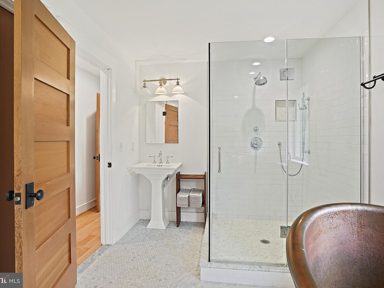 This bathroom features a contemporary layout with a spacious shower area enclosed by clear glass. The walls are adorned with white subway tiles, complemented by a mosaic-patterned floor in soft shades. A classic pedestal sink is centrally positioned beneath a stylish mirror, flanked by coordinating light fixtures that add elegance. To the side, a freestanding copper bathtub introduces a rustic warmth, contrasting beautifully with the modern elements. Natural wood tones from the door and a sleek chair enhance the warm and inviting atmosphere, creating a harmonious blend of luxury and comfort.
