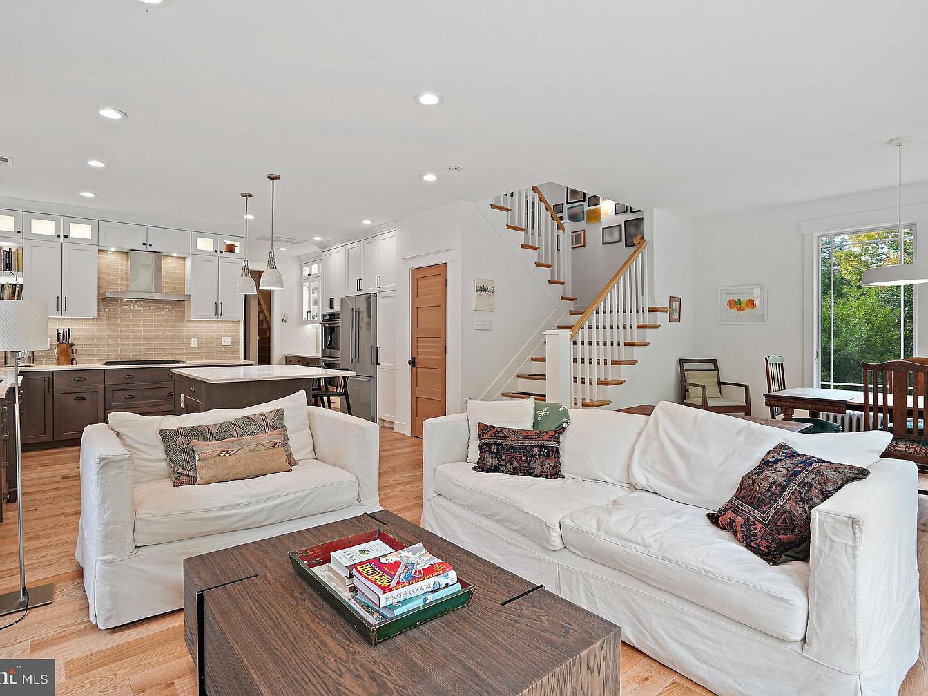 This inviting living room features a cohesive open layout connecting to a modern kitchen. Light wood flooring complements the white walls, enhancing natural brightness. A pair of white sofas, adorned with colorful decorative pillows, offer comfort. A stylish coffee table holds magazines, bridging the gap between seating and the kitchen. The kitchen showcases dark cabinetry and stainless steel appliances, with minimalist pendant lights illuminating the space. An elegant staircase with wooden banisters leads to the upper level, while large windows provide views of the surrounding greenery, emphasizing a harmonious blend of indoor and outdoor living.
