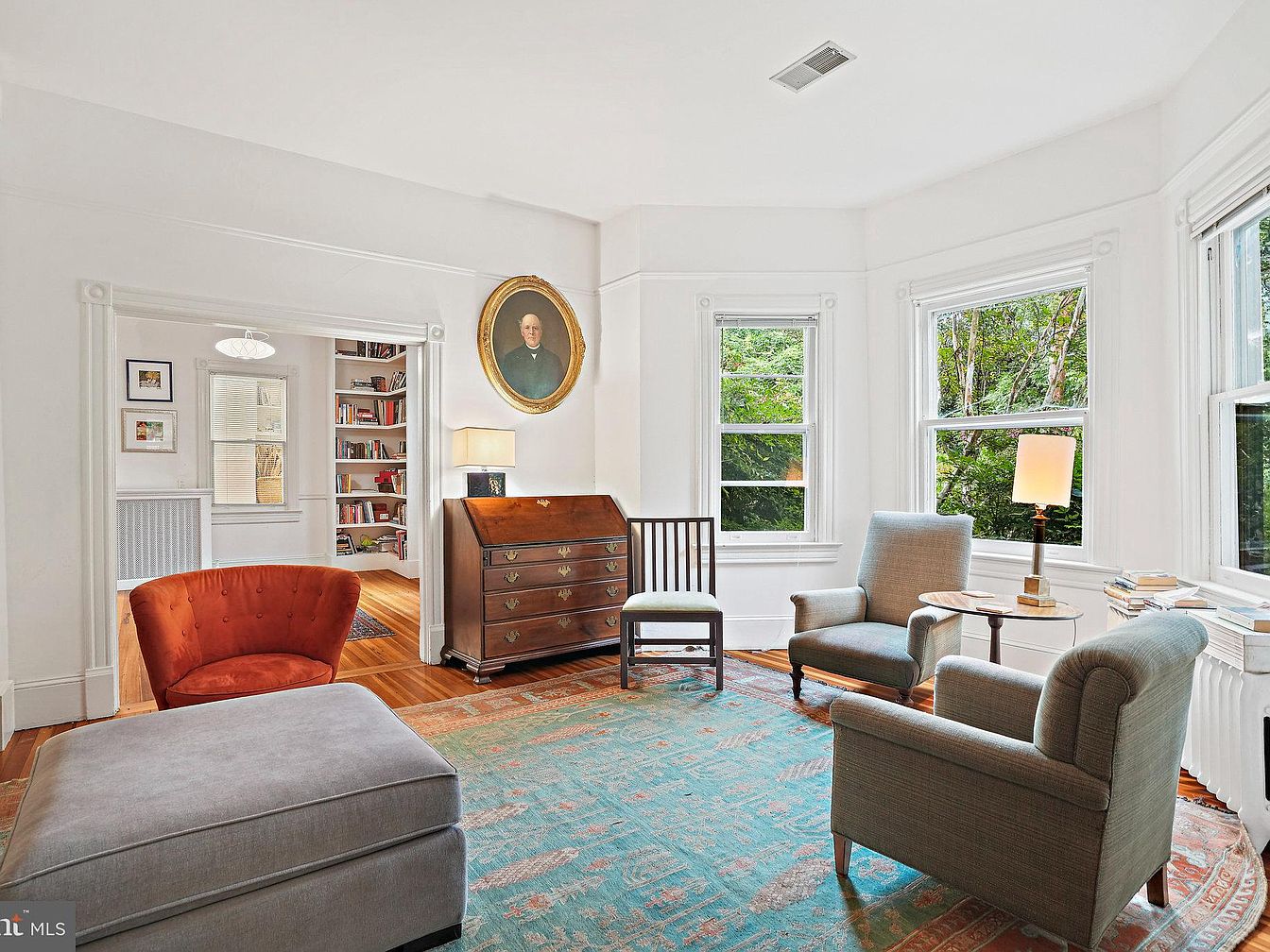 A bright living room features a harmonious blend of comfort and classic design. Soft white walls enhance natural light, accentuated by large windows that frame lush greenery outside. A plush gray ottoman anchors the space, accompanied by a vibrant orange accent chair that introduces warmth. Two upholstered armchairs in muted tones provide inviting seating alongside a sleek side table, topped with a stylish lamp. A wooden chest of drawers stands against the wall, while a family portrait hangs prominently above it, adding a personal touch. Wooden flooring reflects the room’s elegance, complemented by a richly patterned area rug.