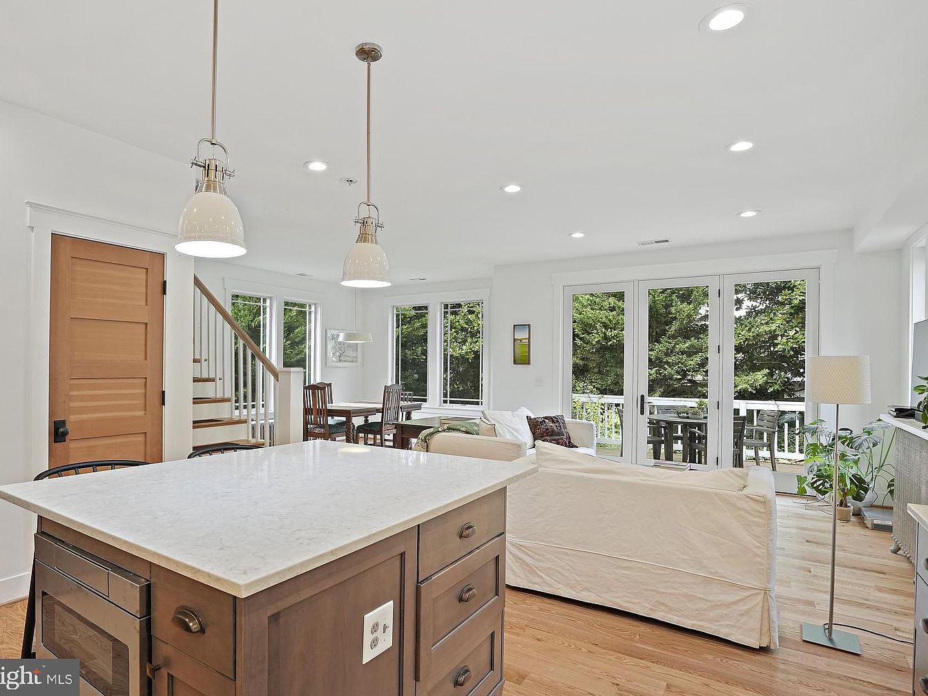 An open-concept living room shines with bright white walls and warm wooden accents, creating a tranquil atmosphere. A large island countertop made of quartz offers ample space, enhancing functionality. Two pendant lights hang elegantly above, casting soft illumination. To the left, a wooden door leads to an inviting staircase, showcasing a natural wood finish. Oversized windows frame lush greenery outside, allowing natural light to flood the space. A comfortable, off-white couch contrasts with earthy brown tones in the decor. A simple floor lamp and potted plants add organic elements, completing the aesthetic of modern simplicity and warmth.