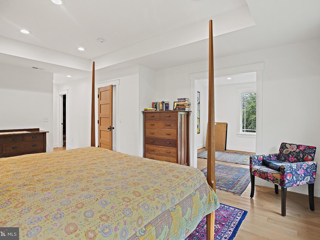 This spacious bedroom features a four-poster bed adorned with a vibrant, patterned quilt, rich in hues of yellow and earthy tones. A wooden dresser stands against one wall, showcasing a minimalist aesthetic, while a floral accent chair adds a pop of color and comfort. The light hardwood flooring enhances the airy feel, complemented by bright white walls and a ceiling with recessed lighting. Ample natural light filters through large windows, illuminating the room. The overall design promotes tranquility and modern elegance, incorporating subtle decorative elements like area rugs that introduce warmth and texture.