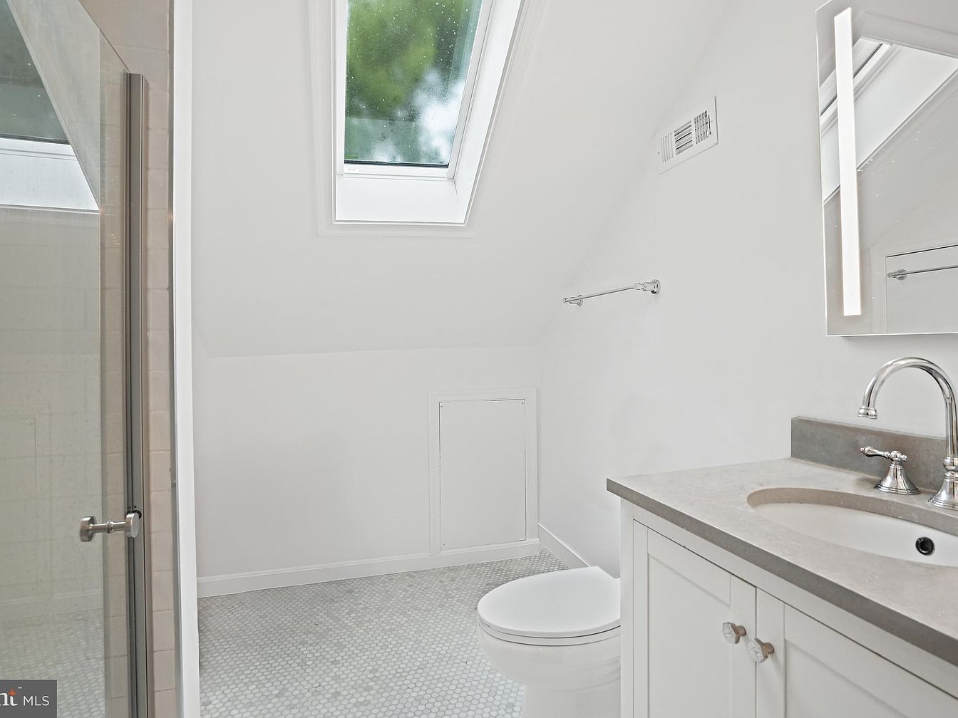 This bathroom features a modern design with a sloped ceiling and skylights, allowing natural light to illuminate the space. The color scheme is predominantly white, creating a clean and airy atmosphere. A glass shower stall is visible, with textured tiles adding subtle detail. The flooring consists of small pebble-like tiles, enhancing the organic feel. A sleek, gray countertop complements white cabinetry, providing a contemporary contrast. Polished chrome fixtures add a touch of elegance. Wall-mounted accessories are minimal, maintaining a streamlined look. This space merges functionality with a stylish aesthetic, ideal for relaxation and convenience.