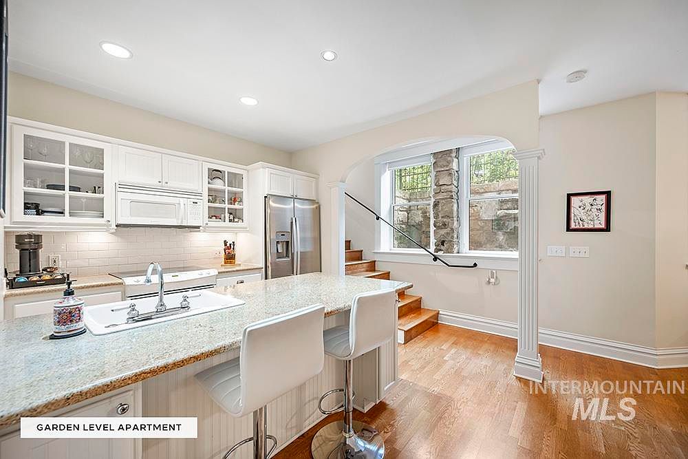 A bright, inviting kitchen space with a large granite-topped island featuring a built-in sink and two modern white barstools. The floor is a warm, honey-toned hardwood. Soft beige walls and white cabinetry with glass panels create a clean, classic look, while stainless steel appliances, including a refrigerator and microwave, add a modern touch. Overhead recessed lighting brightens the room. An arched window above the stairway lets natural light pour in, framing the view of stone garden walls beyond. Decorative trim work and a small framed artwork offer subtle historic charm, blending with the clean, contemporary finishes.
