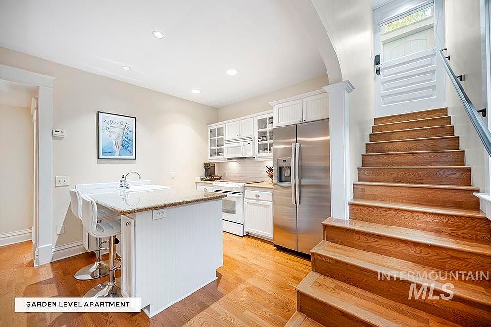 A compact, bright kitchen occupies one side of the space, featuring white cabinetry with beadboard doors, glass-front upper shelves, and stainless steel appliances that include a large refrigerator and range. An island with a neutral stone countertop offers seating for two, with modern white barstools tucked underneath. Warm-toned hardwood flooring extends throughout, including a flight of wooden stairs with white risers leading up to a glass-paneled door, allowing natural light to brighten the space. Light beige walls, recessed lighting, classic trim, and a delicate framed art piece add to the room’s clean, inviting feel.