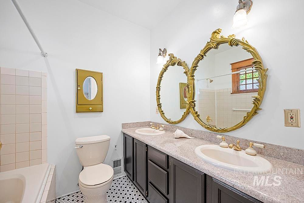 A spacious bathroom features a double-sink vanity with a light-colored stone countertop and dark cabinetry. Two ornate, gold-framed oval mirrors hang above each sink, paired with vintage-style brass and white faucets. The walls are crisp white, enhancing brightness, and decorative light fixtures are mounted above each mirror. A classic white toilet sits between the vanity and the bathtub, while a yellow-gold medicine cabinet adds a retro touch. The flooring consists of intricate black-and-white tile patterns, and a small window with wooden trim allows natural light to enter. The overall style blends historic charm with vintage elegance.
