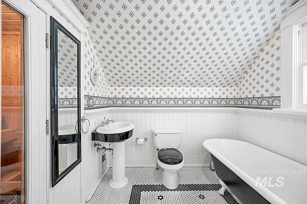 A vintage-style bathroom features a sloped ceiling adorned with patterned wallpaper in black and white diamond motifs, adding visual height and period charm. The lower half of the walls is covered in crisp white beadboard wainscoting, enhancing the classic appeal. A clawfoot tub with a black exterior sits adjacent to a pedestal sink and a toilet, both with black seats or details. The floor is covered in small hexagonal white tiles with a black border, creating a harmonious monochrome palette. A sauna with wood-paneled walls is glimpsed through a glass door, adding a touch of luxury and warmth to the space.