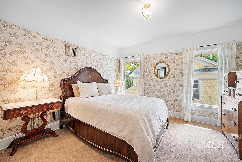 A bright, vintage-inspired bedroom featuring a queen-sized bed with an ornate wooden headboard placed against a wall adorned with delicate floral wallpaper. Matching bedside tables hold decorative lamps with scalloped shades, adding warmth and a soft glow to the room. Light beige carpeting covers the floor, complementing the light cream bedding. Three tall windows draped with sheer, patterned curtains allow ample natural light, enhancing the airy atmosphere. A round mirror adds a touch of elegance above one window, while a classic wooden dresser stands in the corner. The overall aesthetic is cozy and nostalgic, with a traditional architectural charm.