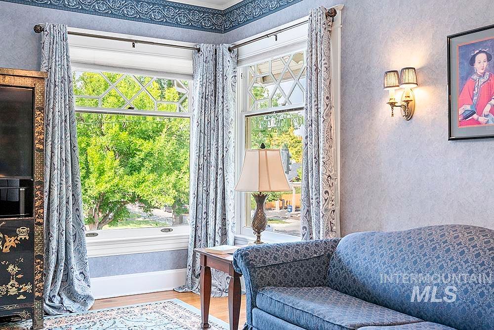 This tranquil sitting room features large, double-hung windows adorned with diamond-pane transoms, allowing ample natural light and views of leafy trees outside. Pale blue damask curtains frame the windows, complementing the rich blue patterned wallpaper with an ornate, embossed border along the ceiling. A vintage blue upholstered loveseat sits beside a polished wooden side table topped with an ornate lamp. Brass wall sconces add soft, ambient lighting, while a framed portrait and an intricately decorated dark wood armoire add character to the space. The decor blends classic charm with a calm, airy feel, evoking historic elegance.