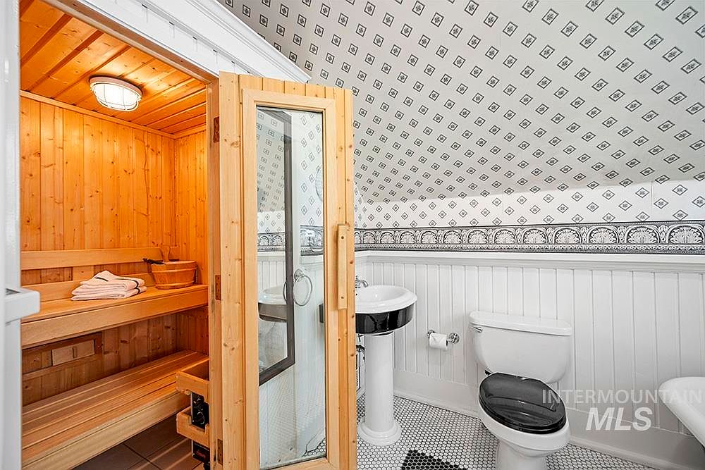 A compact bathroom sits beneath a steeply sloped ceiling adorned with patterned wallpaper in black and white, creating a vintage ambiance. On the left, a cozy wooden sauna features smooth, warm-toned paneling and an interior light, with towels and a traditional sauna bucket resting on a bench. The right side of the room contains a classic pedestal sink, toilet with a black seat, and white beadboard wainscoting. The floor is covered in small hexagonal tiles, echoing the historic charm. This unique space blends relaxation and utility, balancing natural materials and period detailing.