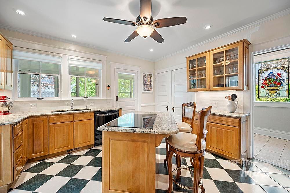 A spacious kitchen featuring warm honey-toned wood cabinetry and elegant marble countertops. At the center, a curved kitchen island with an overhang accommodates two high-back chairs upholstered in cream fabric. The black and white checkered tile floor adds a touch of vintage charm. Light streams in through multi-pane windows above a double sink, and there is a white door with trim on the far wall. Glass-front upper cabinets showcase neatly arranged glassware, while a colorful stained-glass window adds a decorative accent. The space is well-lit with recessed lighting and a central ceiling fan with a frosted light.