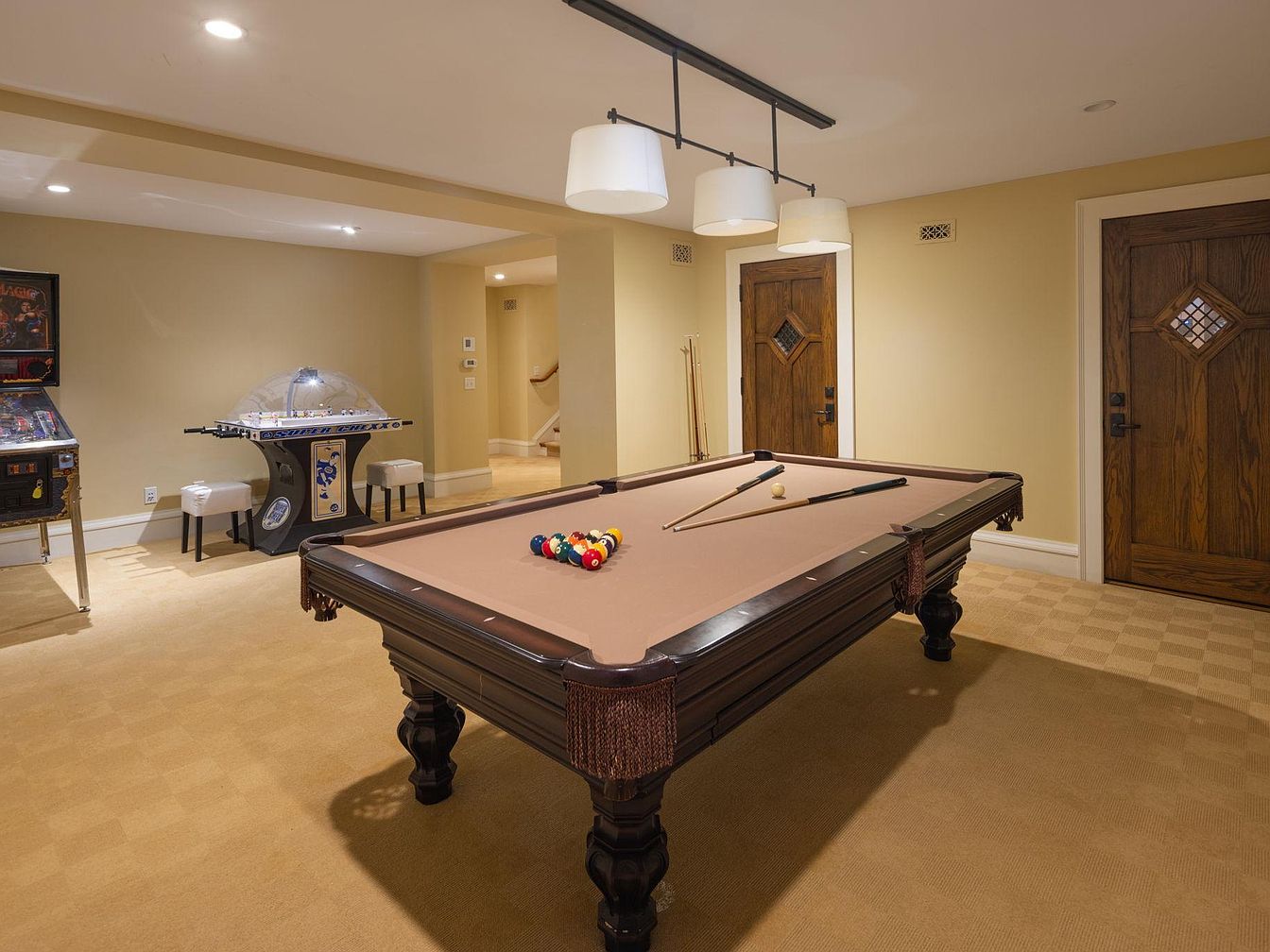 This cozy game room features a classic billiard table as the centerpiece, complete with chalked cues and balls ready for play. The room is illuminated with a sleek multi-bulb light fixture hanging above, enhancing its inviting atmosphere. The walls are painted a warm beige, complementing the soft tan carpeting underfoot. To the side, a vintage pinball machine and a bubble hockey table offer additional entertainment options, showcasing playful nostalgia. Elegant wooden doors with diamond-shaped glass panels add architectural interest, while simple black chairs provide seating without overwhelming the space, creating a functional yet stylish retreat.