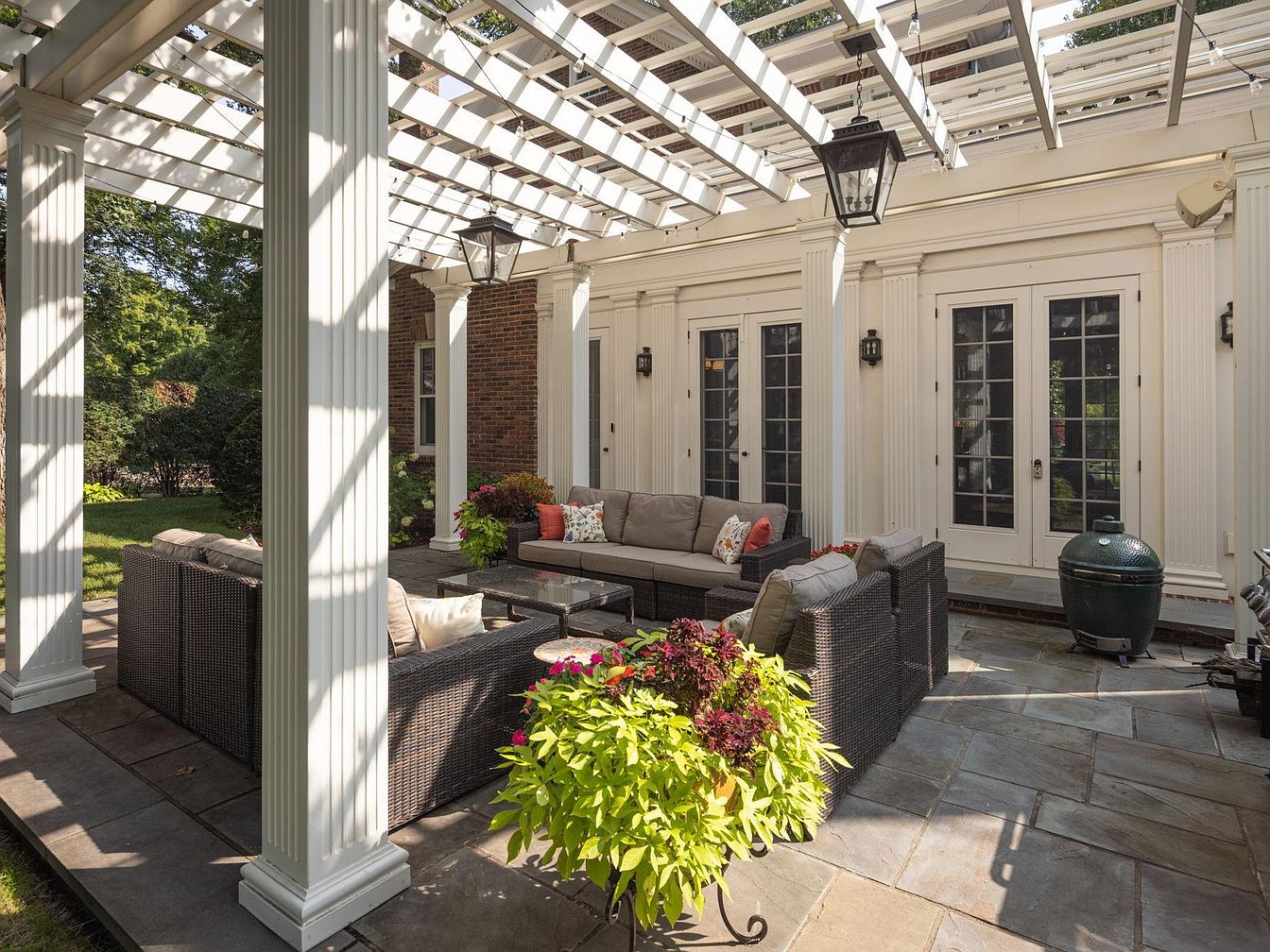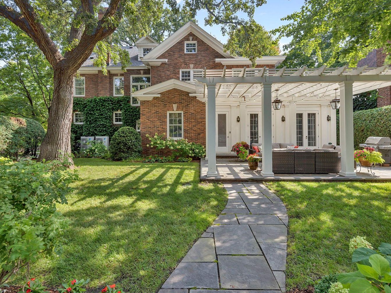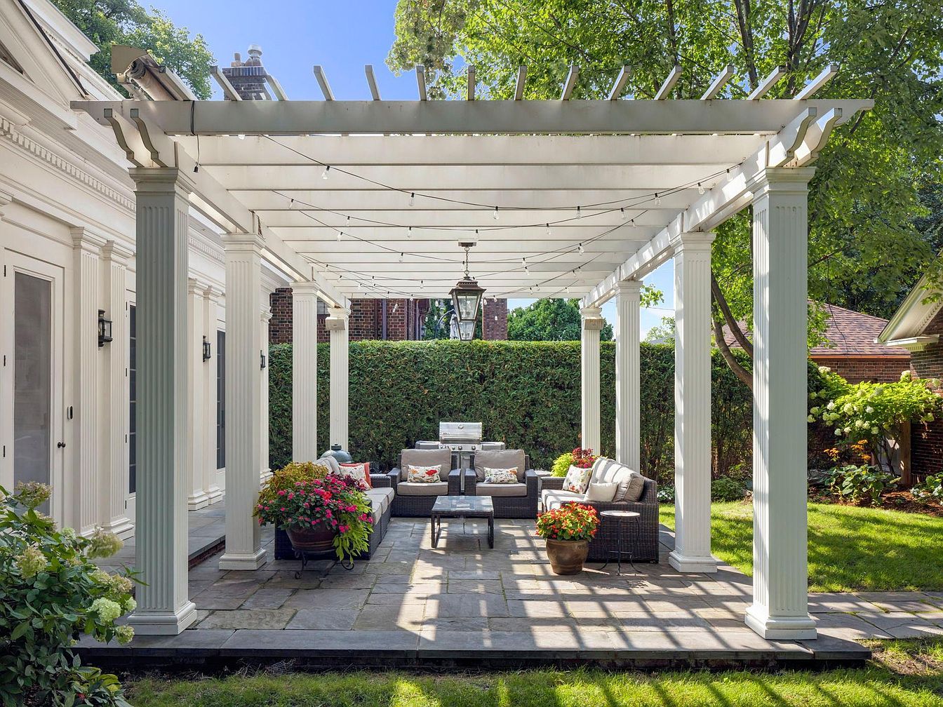 This outdoor patio features a charming blend of natural and structured elements. A broad stone pathway leads through lush green grass towards the patio, accented by planter boxes filled with vibrant flowers. The space is shaded by a striking white pergola, supported by decorative columns that create a relaxed ambiance. Comfortable wicker seating adorned with colorful cushions invites relaxation. Adjacent to the patio, a sturdy grill stands ready for outdoor cooking. The backdrop of the historic brick home, draped in ivy, adds a touch of classic elegance and seamlessly integrates nature with architectural beauty.