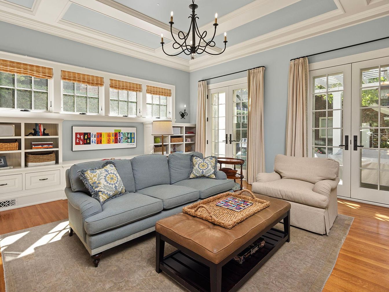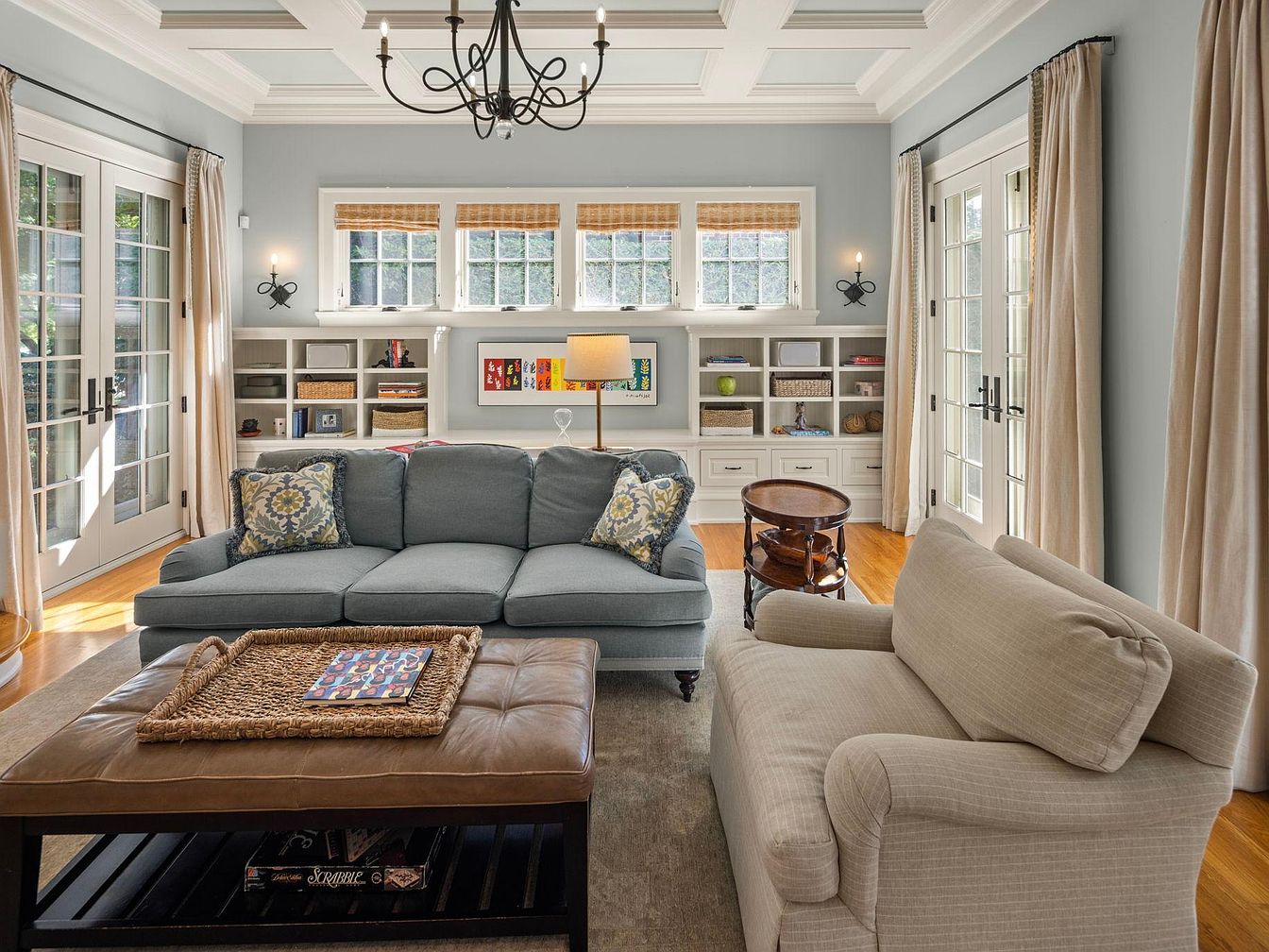 This inviting living room features a coffered ceiling, enhancing its spacious feel. Soft gray walls complement the warm wooden flooring and the large windows provide ample natural light. A blue sofa with decorative pillows creates a focal point, while a plush, neutral-colored armchair offers additional seating. The coffee table stands out with its rich brown leather top and decorative tray, adding texture to the space. Light beige curtains frame the windows, harmonizing with the overall palette. Built-in shelving, adorned with books and decorative items, provides both organization and charm, creating a cozy yet elegant atmosphere.