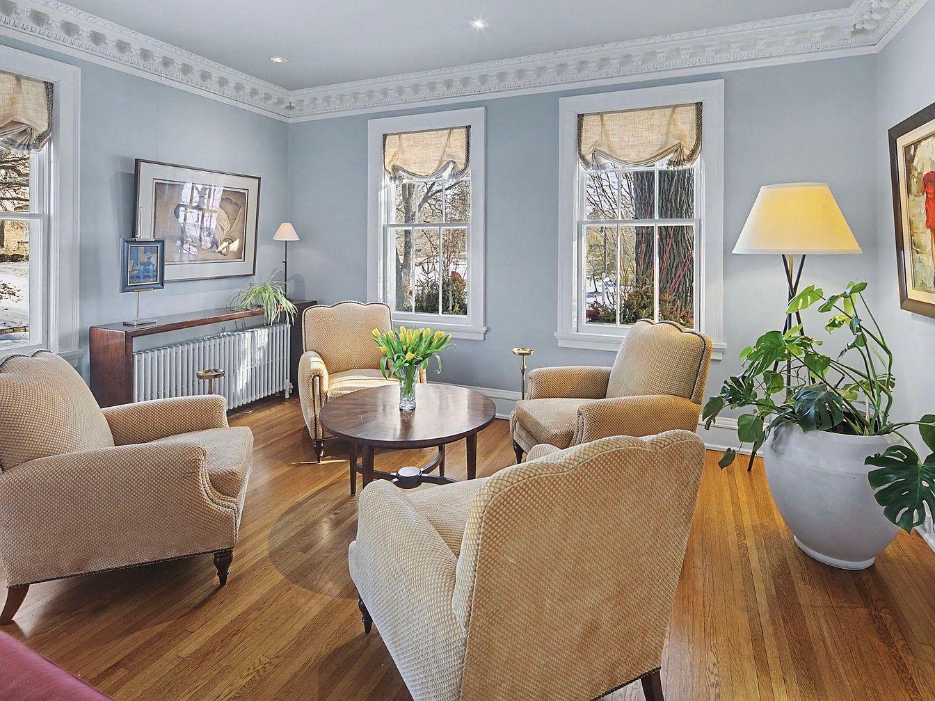This cozy living room features a harmonious blend of modern comfort and classic charm. Light blue walls complement the warm wooden flooring, while natural light filters through the large windows, adorned with simple, light-hued Roman shades. A circular wooden coffee table centers the space, surrounded by plush, beige armchairs that invite relaxation. A sleek radiator runs against the wall, with a decorative console table above it showcasing framed art and a small plant. An elegant floor lamp stands beside one of the chairs, providing warm illumination, while a lush green plant adds a touch of nature, enhancing the inviting atmosphere.