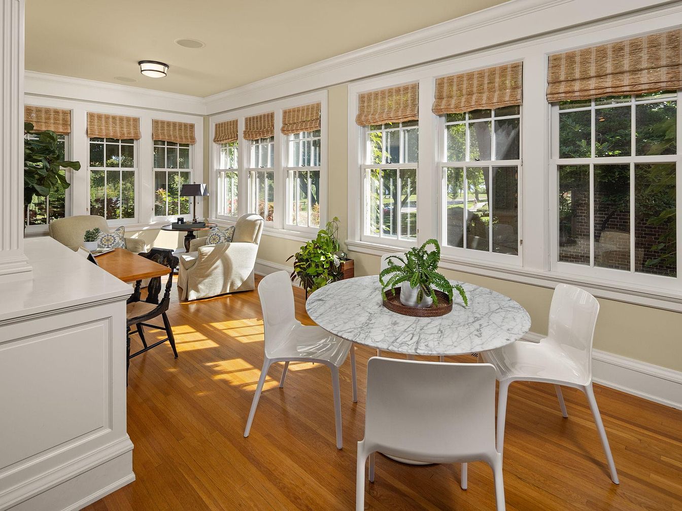 This sunroom features numerous large windows with natural light filtering through, enhancing the warmth of the light-colored walls. A round marble-topped table sits at the center, surrounded by modern white chairs, providing a sleek contrast to the wooden floor. Soft, beige armchairs with floral cushions create a cozy nook for relaxation. The space is adorned with potted plants, adding greenery to the atmosphere. Woven shades on the windows offer a touch of texture, while a small side table houses a lamp, perfect for reading. Overall, the design blends contemporary elements with classic comfort, creating an inviting ambiance.