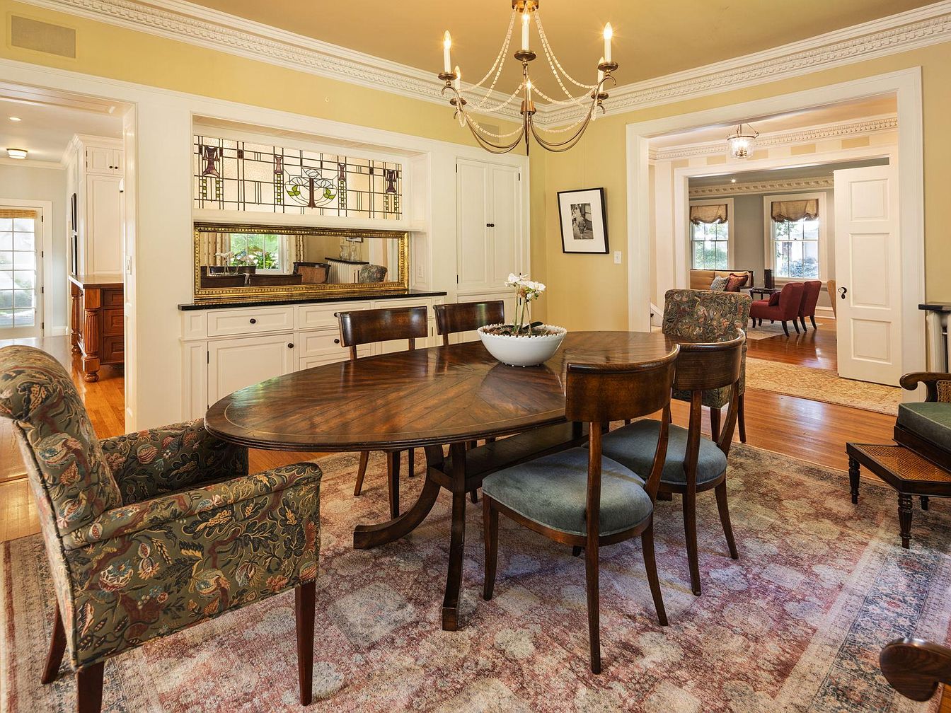 The dining room features a large, round wooden table surrounded by elegantly designed chairs, showcasing a rich, dark wood finish. A decorative area rug adds warmth, while the floral-patterned armchair introduces a splash of color. Walls painted in soft yellow complement the intricate crown molding and the vintage chandelier above. An eye-catching stained glass window separates this space from the adjacent room, enhancing the classic aesthetic. Natural light floods in through multiple windows, highlighting the curated decor and polished wooden floors. The ambiance radiates a blend of sophistication and comfort, ideal for family gatherings or entertaining guests.