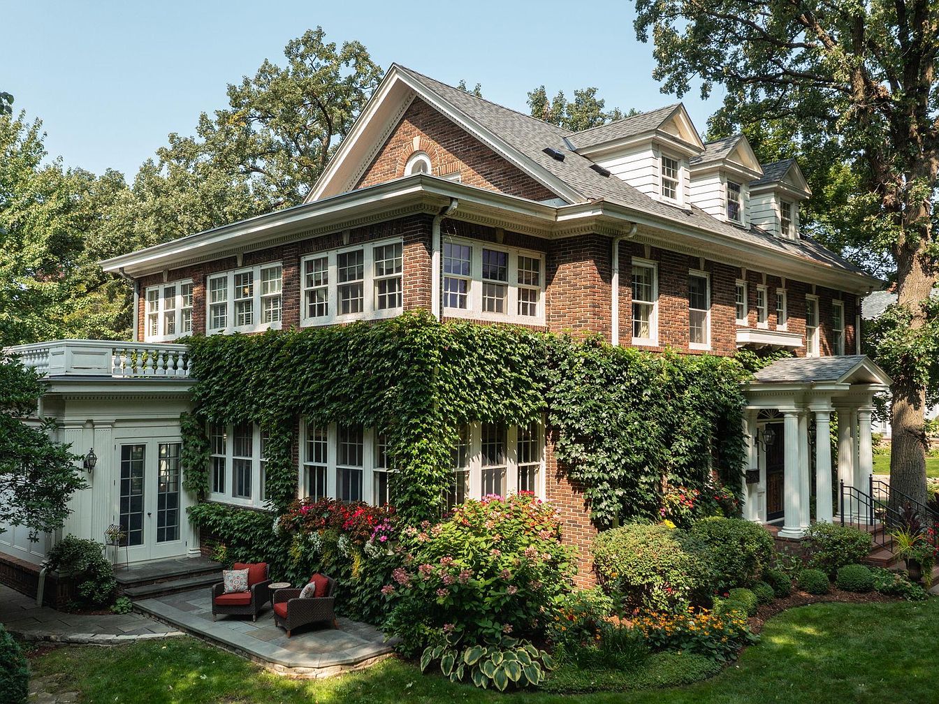 The image showcases a historic American home characterized by its rich brick exterior and elegant architectural details. Lush green ivy cascades down one side of the structure, blending seamlessly with the vibrant flower beds filled with colorful blooms. The entrance is defined by grand white columns supporting a stylish overhang, inviting warmth and charm. Abundant windows, framed in white, reflect natural light, enhancing the cozy feel. A well-manicured lawn with neatly trimmed bushes complements the greenery, while a tasteful outdoor seating area hints at leisure and social gatherings. The overall color palette creates an inviting, harmonious aesthetic.
