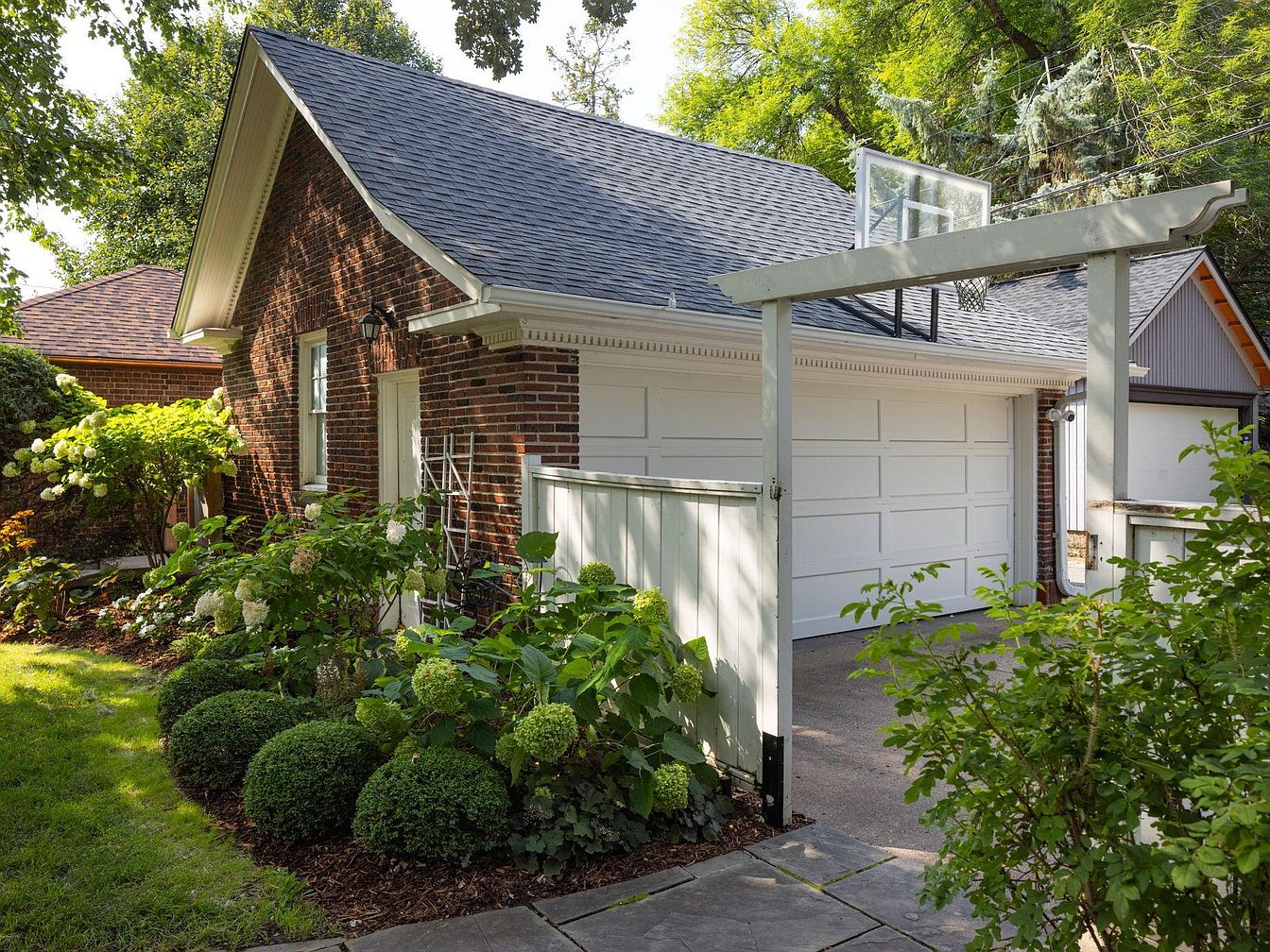 The garage entrance features a lush, landscaped pathway framed by neatly trimmed boxwoods and blooming hydrangeas. The brick exterior of the garage showcases a warm, earthy tone complemented by a classic white door with subtle paneling. A durable grey slate pathway leads to the entrance, enhancing the rustic charm. Above, a simple wooden arch supports a basketball hoop, integrating recreational space into the home’s design. Sunlight filters through the trees, creating a bright, inviting atmosphere. The combination of natural foliage and structured elements adds a serene yet functional aesthetic to this functional outdoor area.