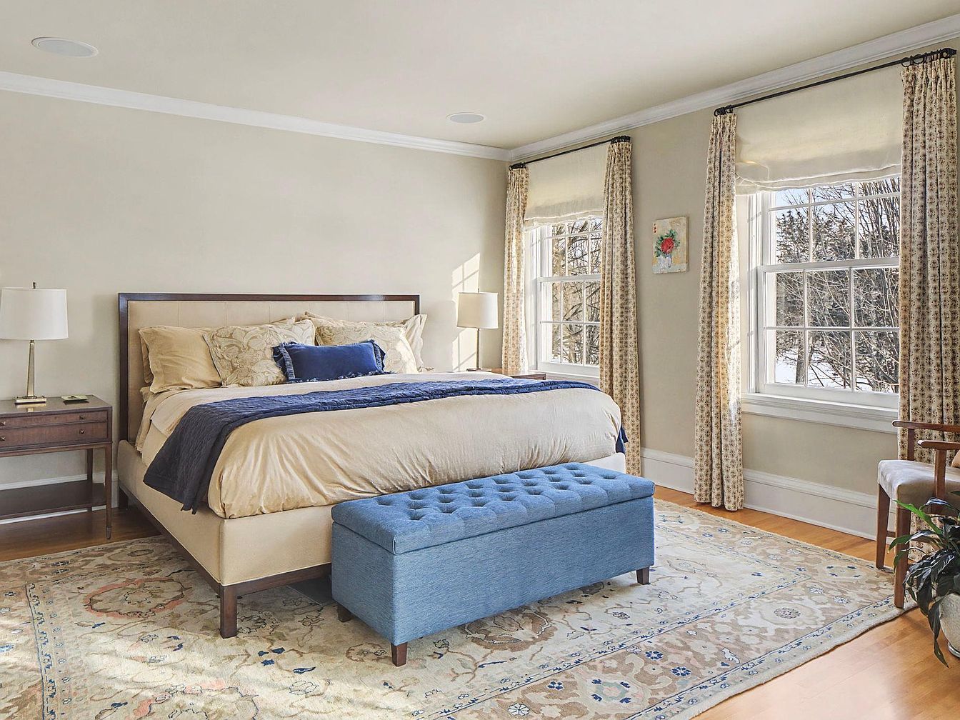 A spacious bedroom featuring a neutral color scheme with soft beige walls, complemented by a warm wooden floor. The large bed is centrally positioned, adorned with plush beige and navy bedding, and flanked by sleek bedside tables with matching lamps. A stylish tufted blue ottoman resides at the foot of the bed, contrasting beautifully with the light tones. Natural light floods the room through two wide windows, dressed in light, patterned curtains that frame the view of lush greenery outside. An area rug with floral patterns adds texture and warmth, enhancing the inviting atmosphere.