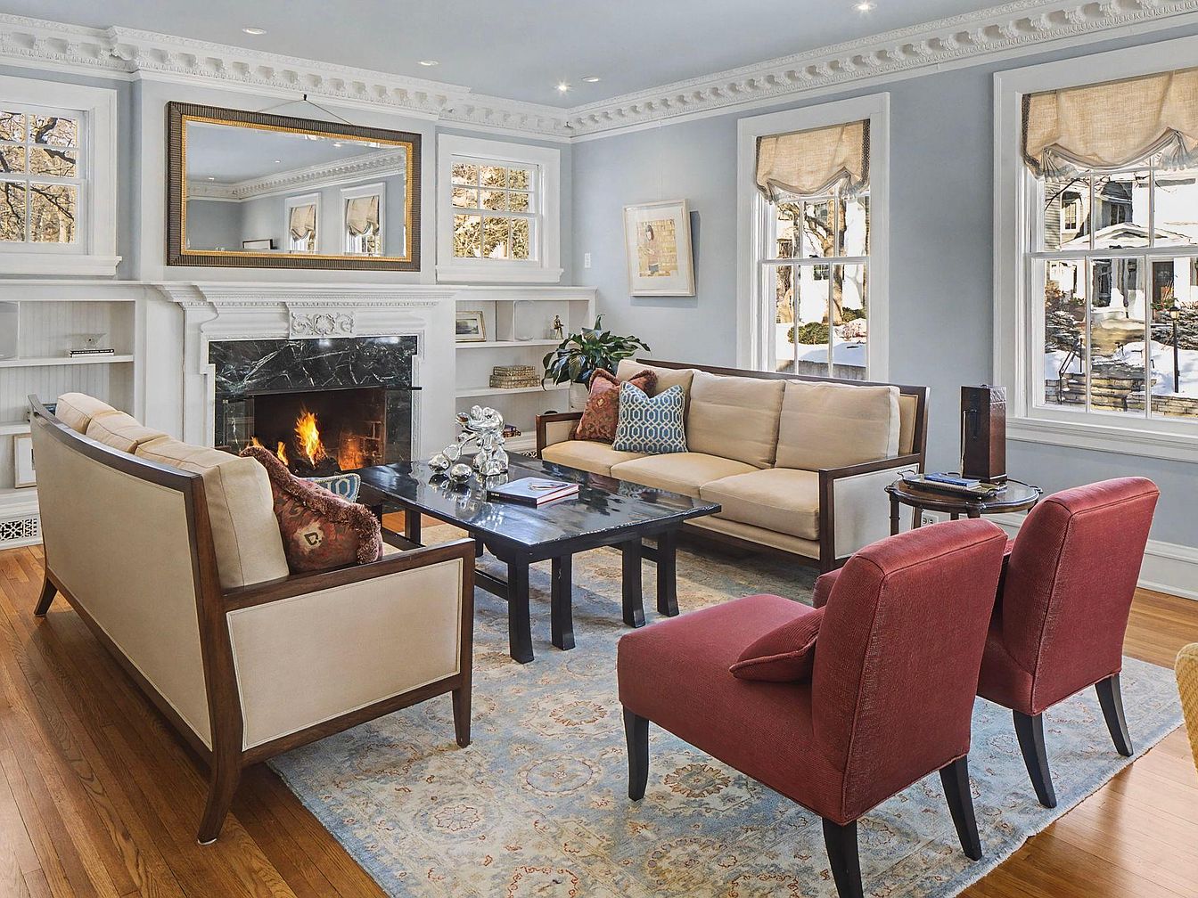 This living room features a blend of classic and contemporary design elements. A neutral color palette of light blue walls and warm wooden flooring creates a serene atmosphere. The room centers around a sleek black coffee table, flanked by a comfortable sofa adorned with patterned cushions and two elegant red chairs that add a pop of color. A large ornate mirror above the white marble fireplace reflects natural light, enhancing the space’s openness. Built-in shelves display decorative items, while the large windows with soft fabric shades invite sunlight. Overall, it exemplifies a harmonious and inviting space.