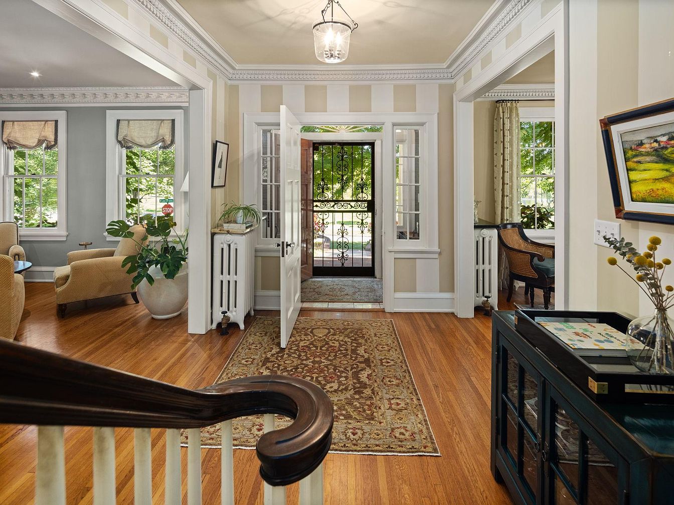 This entryway features elegant hardwood flooring and a classic layout. Soft, muted colors dominate the walls, with subtle stripes enhancing the openness. Large windows invite natural light, showcasing decorative window treatments. A prominent, welcoming double door opens to the outdoors, framed by intricate moldings. A round rug adds warmth underfoot, while a sleek, dark console table displays decorative items. Unique architectural details, like the ceiling light fixture and the staircase’s curved railing, contribute to the vintage charm. Potted plants and artwork punctuate the space, creating a cozy yet sophisticated ambiance ideal for greeting guests.